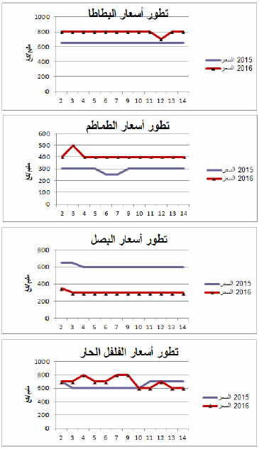 - ارتفاع في الأسعار بالنسبة لأغلب أصناف الخضر ما عدى البصل (-50 %).