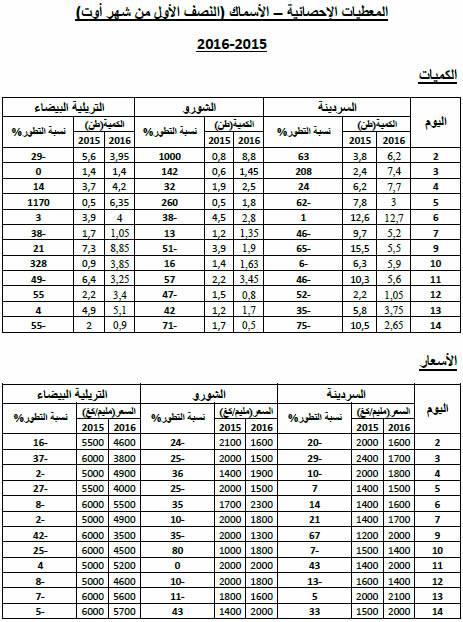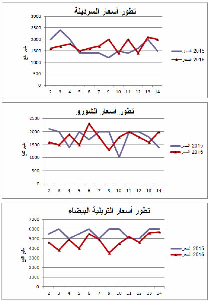 - ارتفاع نسبي في الأسعار بالنسبة للسردينة مقابل انخفاض بالنسبة للتريلية البيضاء.