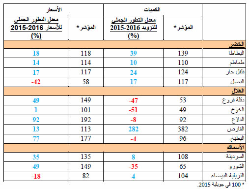 البصل: زيادة نسبية في التزويد مقارنة بنفس الفترة من سنة 2015 ويقدر مؤشر الكميات بـ 117.