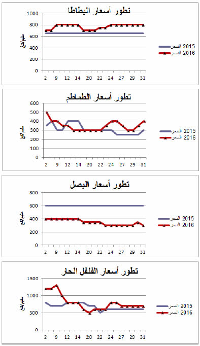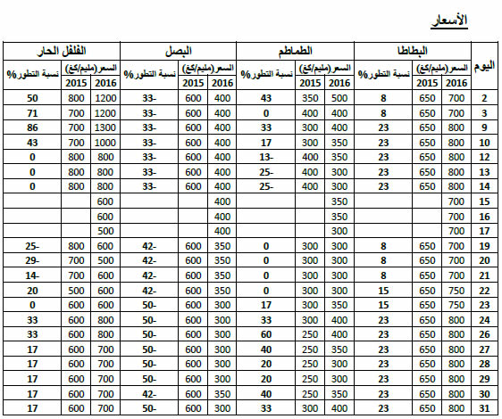 - ارتفاع نسبي في الأسعار بالنسبة لأغلب أصناف الخضر ما عدى البصل (-42%).