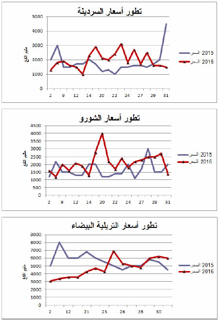 - ارتفاع في الأسعاربالنسبة للسردينة (+35%) والشورو(+49%) مقابل انخفاض بالنسبة للتريلية البيضاء (-18%).