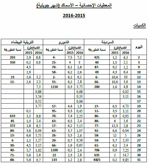 السردينة :زيادة في التزويد مقارنة بنفس الفترة من سنة 2015 ويقدر مؤشر الكميات بـ 108.
