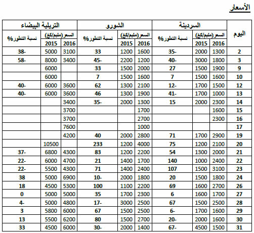 الشورو: ارتفاع في الأسعار مقارنة بنفس الفترة لسنة 2015 ويقدر مؤشر الأسعار بـ149.
