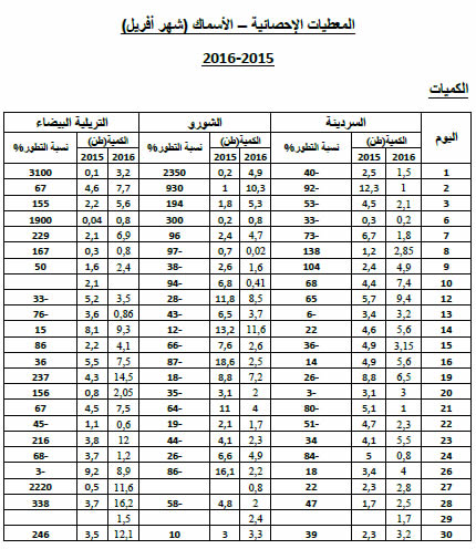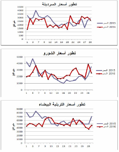 - انخفاض نسبي في الأسعار بالنسبة للسردينة والتريلية البيضاء مقابل ارتفاع نسبي بالنسبة للشورو.