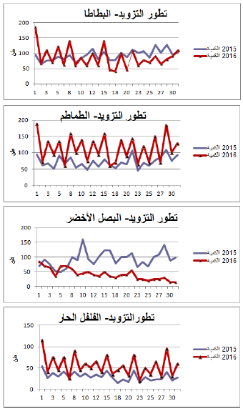 - زيادة في التزويد بالنسبة للطماطم (+58%) والفلفل الحار(+83%) مقابل تراجع بالنسبة للبصل الأخضر (-52%) والبطاطا (-8%).