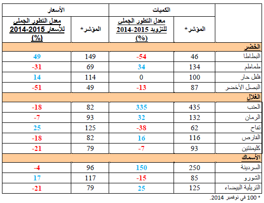 معدل التطور الجملي للتزويد والأسعار لأهم المواد الأساسية بالنسبة لشهر نوفمبر (2014-2015)