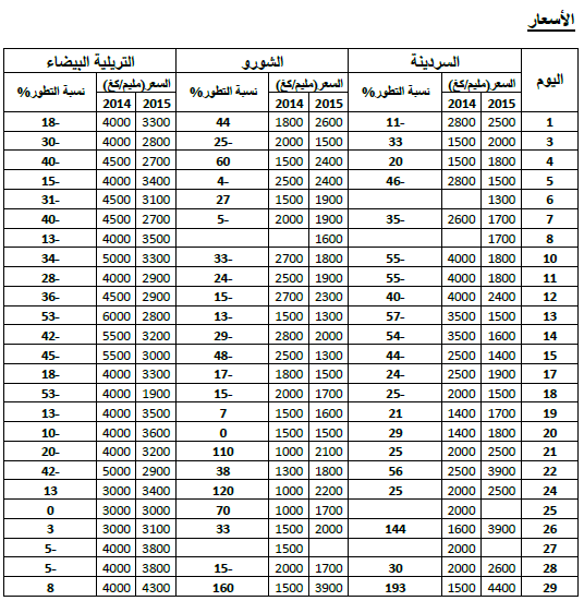 الشورو: ارتفاع نسبي في الأسعار مقارنة بنفس الفترة لسنة 2014 ويقدر مؤشرالأسعار بـ117.
