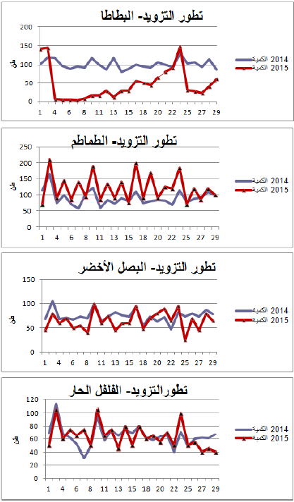 - تراجع في التزويد بالنسبة البصل الأخضر(-13%) والبطاطا (-54%) مقابل زيادة في التزويد بالنسبة للطماطم (+34%) .
