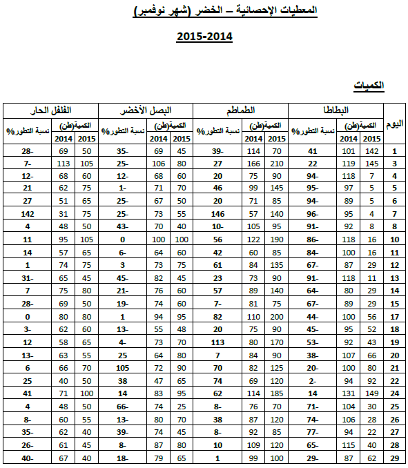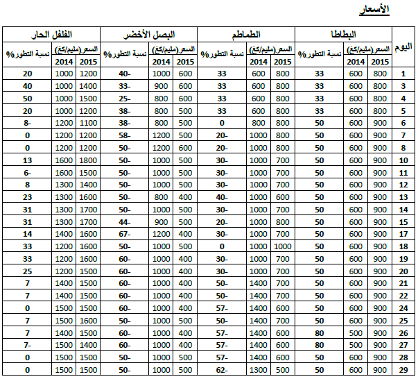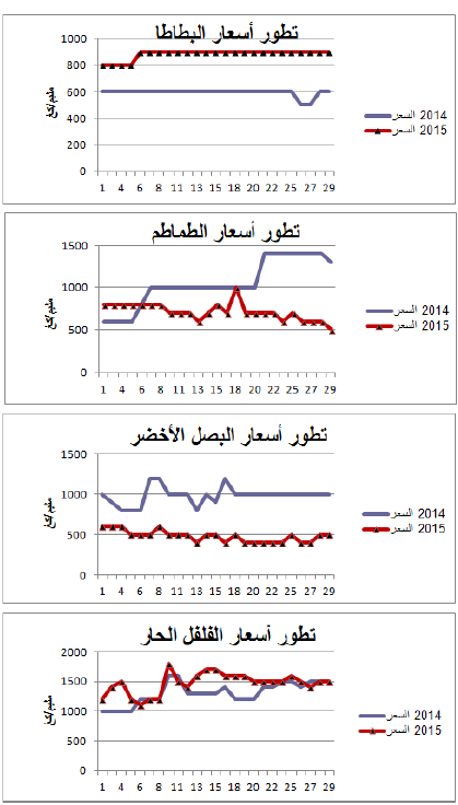 - انخفاض في الأسعار بالنسبة للطماطم (-31%) والبصل الأخضر (-51%) مقابل ارتفاع بالنسبة للبطاطا (+49%) والفلفل الحار (+14%).
