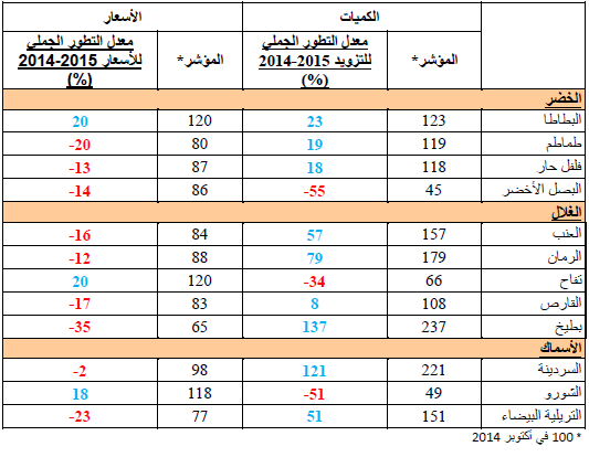 - انخفاض في الأسعار بالنسبة للتريلية البيضاء (-23%) مقابل زيادة نسبية بالنسبة للشورو (+18%).معدل التطور الجملي للتزويد والأسعار لأهم المواد الأساسية بالنسبة لشهر أكتوبر (2014-2015)
