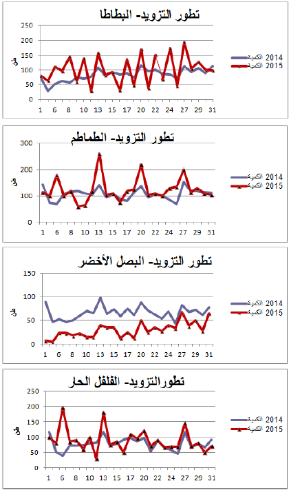 البطيخ: زيادة في التزويد مقارنة بنفس الفترة من سنة 2014 ويقدر مؤشر الكميات بـ237.