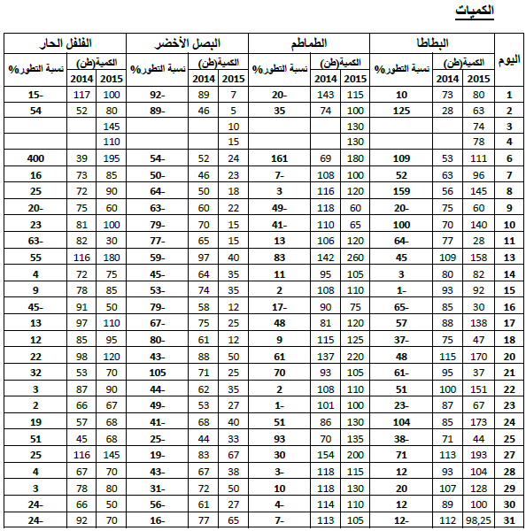 البصل الأخضر:تراجع في التزويد مقارنة بنفس الفترة من سنة 2014 ويقدر مؤشر الكميات بـ 45.