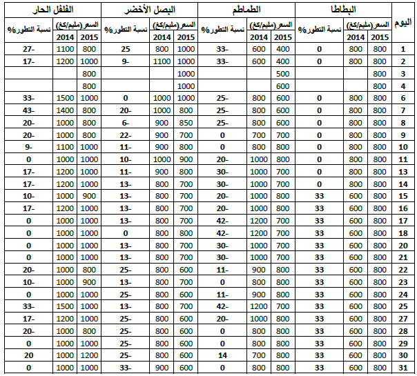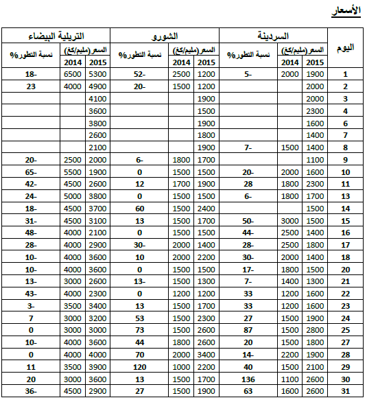 الشورو: ارتفاع نسبي في الأسعار مقارنة بنفس الفترة لسنة 2014 ويقدر مؤشرالأسعار بـ 118.