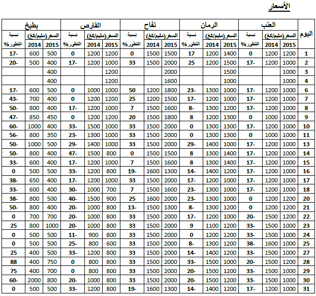 - انخفاض نسبي في الأسعار بالنسبة لأغلب أصناف الغلال ماعدى التفاح (+20%).