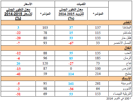 معدل التطور الجملي للتزويد والأسعار لأهم المواد الأساسية بالنسبة للنصف الأول من شهر أكتوبر (2014-2015)