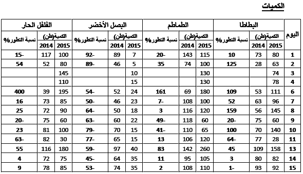 - زيادة في التزويد بالنسبة لأغلب الأصناف ما عدى البصل الأخضر (-67%). مع العلم أنه قد تم تزويد السوق خلال النصف الأول من شهر أكتوبر 2015 بكميات هامة من البصل الجاف تقدر بـ 818 طن.