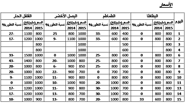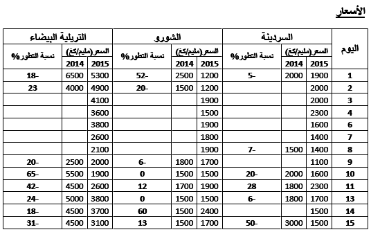 الشورو : استقرار نسبي في الأسعار مقارنة بنفس الفترة لسنة 2014 ويقدر مؤشرالأسعار بـ 98.