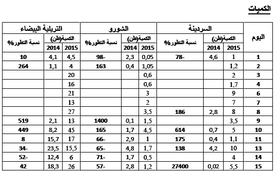 السردينة :زيادة هامة في التزويد مقارنة بنفس الفترة من سنة 2014 ويقدر مؤشر الكميات بـ 261.