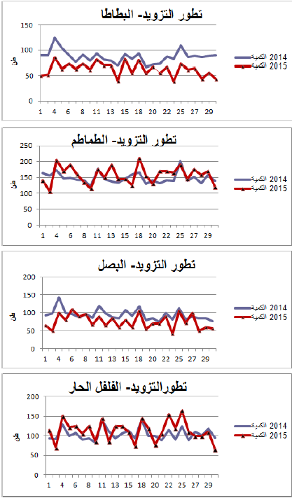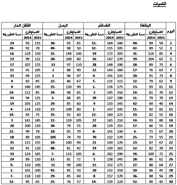 - زيادة نسبية في التزويد بالنسبة للفلفل الحار(+8%) والطماطم (+7%) مقابل تراجع نسبي بالنسبة للبصل (-20%) والبطاطا (-28%).
