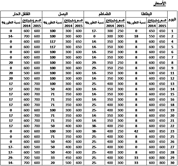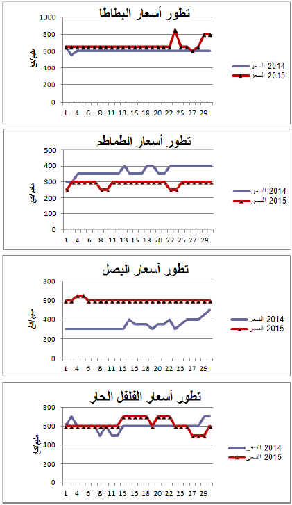 - ارتفاع في الأسعار بالنسبة للبصل (+77%) والبطاطا (+11%) مقابل انخفاض نسبي بالنسبة للطماطم (-21%) .