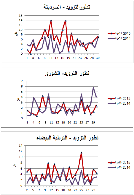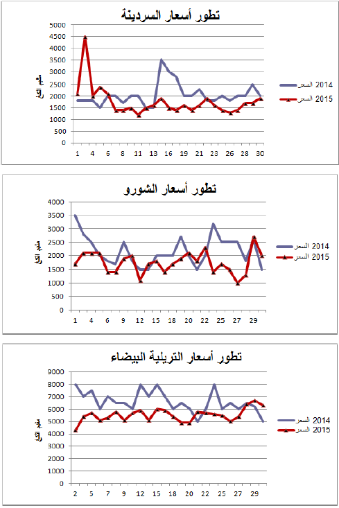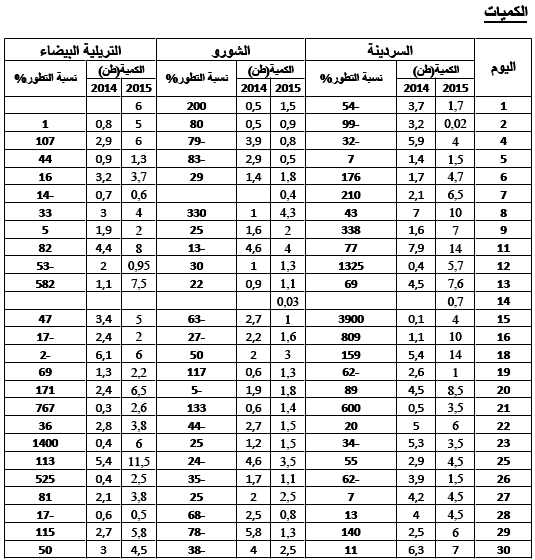 السردينة:زيادة في التزويد مقارنة بنفس الفترة من سنة 2014 ويقدر مؤشر الكميات بـ 175.
