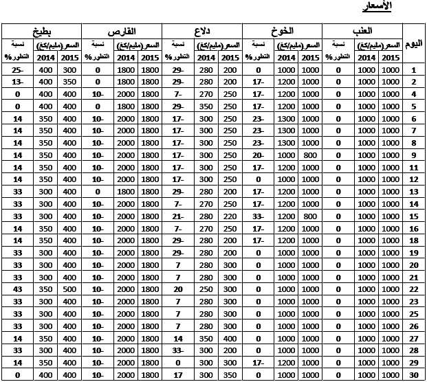 العنب: استقرار في الأسعار مقارنة بنفس الفترة من سنة 2014.