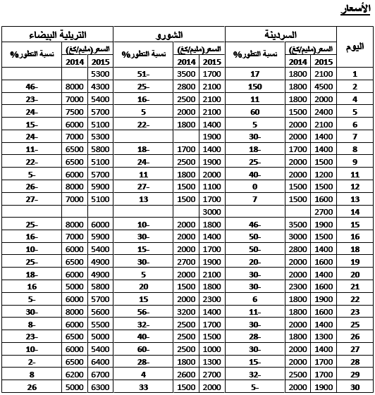الشورو : انخفاض نسبي في الأسعار مقارنة بنفس الفترة لسنة 2014 ويقدر مؤشرالأسعار بـ 87.