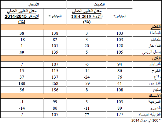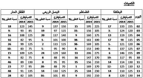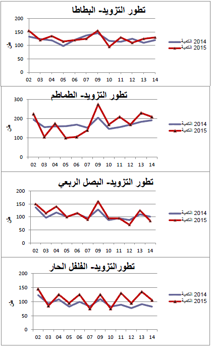 البصلالربعي: زيادة نسبيةفي التزويد مقارنة بنفس الفترة من سنة 2014 ويقدر مؤشر الكميات بـ 105.