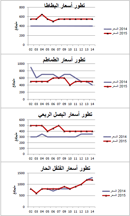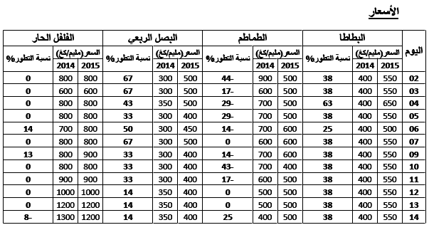 - ارتفاع في الأسعار بالنسبة للبصل (+39%) والبطاطا (+38%) مقابل انخفاض بالنسبة للطماطم      (-18%).