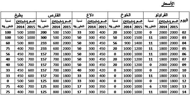 القارص: ارتفاع هام في الأسعار مقارنة بنفس الفترة من سنة 2014 ويقدر مؤشرالأسعار بـ 268.