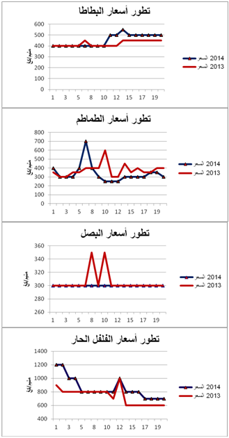 - البصل: استقرار نسبيفي الأسعار مقارنة بنفس الفترة من سنة 2013 ويقدر المعدل الجملي لتطور الأسعار بـ -2%.