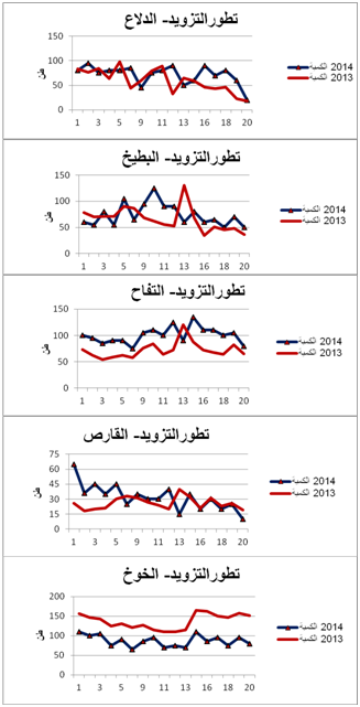 - الدلاع : زيادة نسبية في التزويد مقارنة بنفس الفترة من سنة 2013 ويقدر معدل التطور الجملي للتزويد بـ+14%.