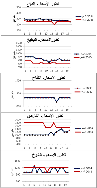 - القارص : انخفاض في الأسعار مقارنة بنفس الفترة من سنة 2013 ويقدر معدل التطور الجملي للأسعار بـ-33%.