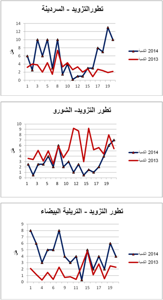- السردينة : زيادة في التزويد مقارنة بنفس الفترة من سنة 2013 ويقدر معدل التطور الجملي للتزويد بـ+81%.