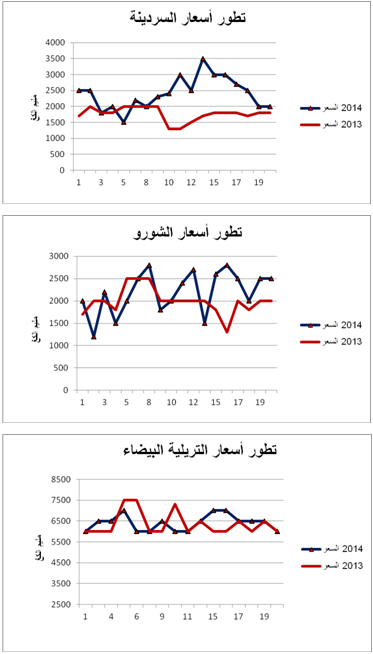 - السردينة : ارتفاع في الأسعار مقارنة بنفس الفترة من سنة 2013 ويقدر المعدل الجملي لتطور الأسعار بـ+36%.